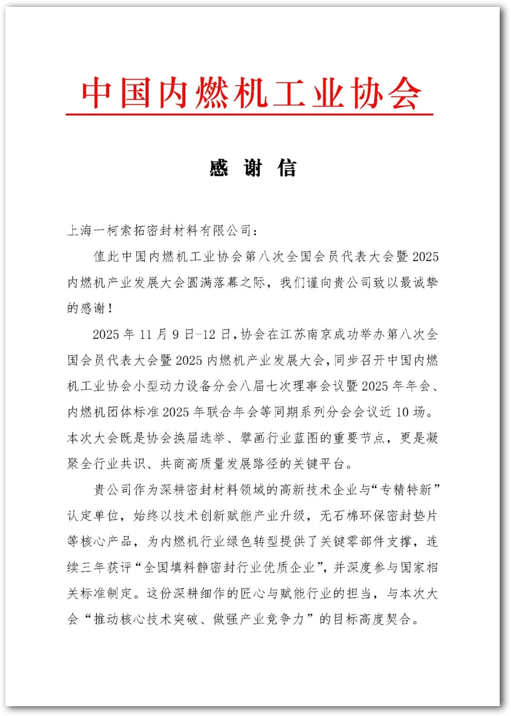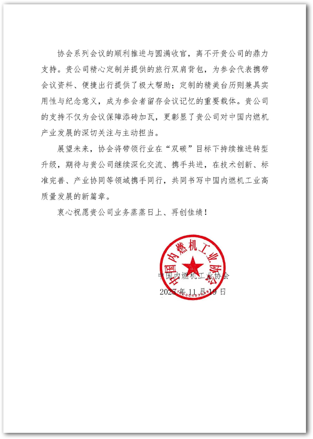 來自中國內(nèi)燃機(jī)工業(yè)協(xié)會的感謝信 近日,我司收到來自中國內(nèi)燃機(jī)工業(yè)協(xié)會的感謝信,也借此機(jī)會感謝協(xié)會的多年信任和支持,作為會員我們一直全力盡責(zé)盡職并很榮幸作為其中一員推動協(xié)會和行業(yè)的發(fā)展。并再次祝賀大會的成功召開。 上一個 返回列表 下一個